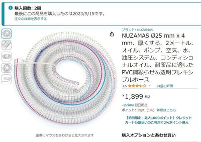 予備に再購入したのは このホース 鉄線が入っているので曲げても折れて閉鎖されずにRを描きます 洗濯用の排水ホースも折れにくいように骨が入っていますが、流れる水が見えるこっちの方がかっこいいかなと思うのであります